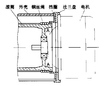 鋼絲繩電動葫蘆在使用過程中經(jīng)常發(fā)生纏繩事故。特別是當(dāng)鋼絲繩卡于滾筒與升降電機(jī)之間的縫隙時(圖1中A區(qū)),處理的方法只能是拆下電機(jī),取出鋼絲繩。既費時,又費力,還耽誤正常的生產(chǎn),有時為了維持生產(chǎn),將鋼絲繩用氣焊割斷,留下的斷鋼絲繩極容易磨損滾筒和電機(jī)外殼,造成更大的設(shè)備事故。