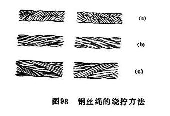 綜合以上兩種繞擰方式二繞成的鋼絲繩叫混合繞擰式。如圖98(c)所示。它具有單向繞擰式的一些優(yōu)點(diǎn),并不會自行松散和扭轉(zhuǎn)。