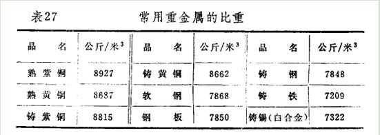 確定重大物件重量的方法,一般是先測(cè)量貨物的長(zhǎng)、寬、高,把它們相乘后再去乘貨物的比重。為了便于計(jì)算,現(xiàn)將幾種重金屬的比例列于表27.