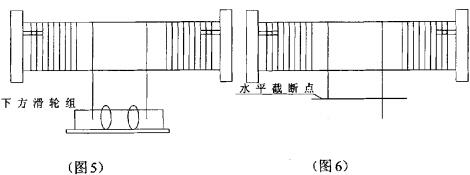 6、四根鋼絲繩截?cái)嗪螅倬砥痄摻z繩至滑輪組處后(如圖5),將四根鋼絲繩同時(shí)穿過對(duì)應(yīng)的滑輪,拉出5米左右,安裝楔套式接頭,安裝時(shí)返回壓緊鋼絲繩尺寸必需相同,繩頭穿過楔套式接頭卡好第一繩卡,用手拉葫蘆拉緊后安裝好其它繩卡即可,繩卡方向要正確,接頭安裝完成后依次拉上平衡臂卡好即可。