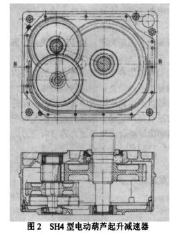 在起重機(jī)械中生產(chǎn)量最大,使用最廣泛的電動葫蘆,它選擇不到標(biāo)準(zhǔn)減速器,它必須由設(shè)計者感覺電動葫蘆起升機(jī)構(gòu)總體的設(shè)計要求設(shè)計電動葫蘆專用的起升減速器,當(dāng)然也包括設(shè)計電動小車的減速器。按圖1的總體部件的布置,起升減速器一端與電動機(jī)鏈接,另一端與卷筒裝置鏈接。電動機(jī)的輸出軸頭是小齒輪,它與減速器第一級大齒輪嚙合:減速器的最后一級輸出軸是花鍵,它直接雨卷筒鏈接。SH4型減速器見圖2.