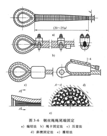 鋼絲繩在使用中需與其他承載構(gòu)件連接傳遞載荷,繩端連接處應(yīng)牢固可靠,常用的繩端固接方式(見圖3-6)。