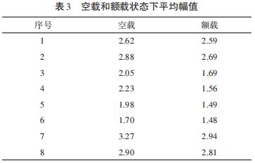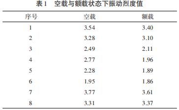檢測(cè)時(shí),電動(dòng)葫蘆應(yīng)處于規(guī)定的運(yùn)行狀態(tài),即電動(dòng)葫蘆在額定轉(zhuǎn)速、額定電壓下的穩(wěn)定工作狀態(tài)。如果所測(cè)振動(dòng)大于該方法所允許接受的范圍,且受過(guò)度背景干擾,應(yīng)停機(jī)進(jìn)行檢測(cè),以確定外界的影響程度。機(jī)器靜止時(shí)所測(cè)振動(dòng)烈度值(速度的均方根值)超過(guò)運(yùn)行時(shí)的25%,必須進(jìn)行修正,以減少背景振動(dòng)對(duì)檢測(cè)的影響。本研究選擇鋼絲繩電動(dòng)葫蘆空載時(shí)對(duì)其運(yùn)行狀況進(jìn)行檢測(cè)。空載運(yùn)行時(shí),將采用振動(dòng)檢測(cè)的方法得到的速度的均方根值中最大值作為參考數(shù)值。此外,對(duì)選擇在空載還是帶載的情況下對(duì)電動(dòng)葫蘆進(jìn)行檢測(cè)也進(jìn)行了研究。對(duì)電動(dòng)葫蘆減速箱進(jìn)行檢測(cè)的同時(shí),不考慮電動(dòng)葫蘆沿軌道運(yùn)行的情況,因?yàn)檫@時(shí)減速箱并不工作,而只考慮電動(dòng)葫蘆的空載升降、帶載升降狀態(tài)。針對(duì)這樣的狀況,在試驗(yàn)過(guò)程中選取了8臺(tái)電動(dòng)葫蘆,分別對(duì)這8臺(tái)電動(dòng)葫蘆空載上升、額載上升的兩種穩(wěn)定的工作狀態(tài)進(jìn)行振動(dòng)檢測(cè),得到振動(dòng)烈度、方根幅值、平均幅值這三個(gè)主要參數(shù),并分析上述兩種狀態(tài)下這三個(gè)參數(shù),參數(shù)與分析見(jiàn)表1、表2、表3